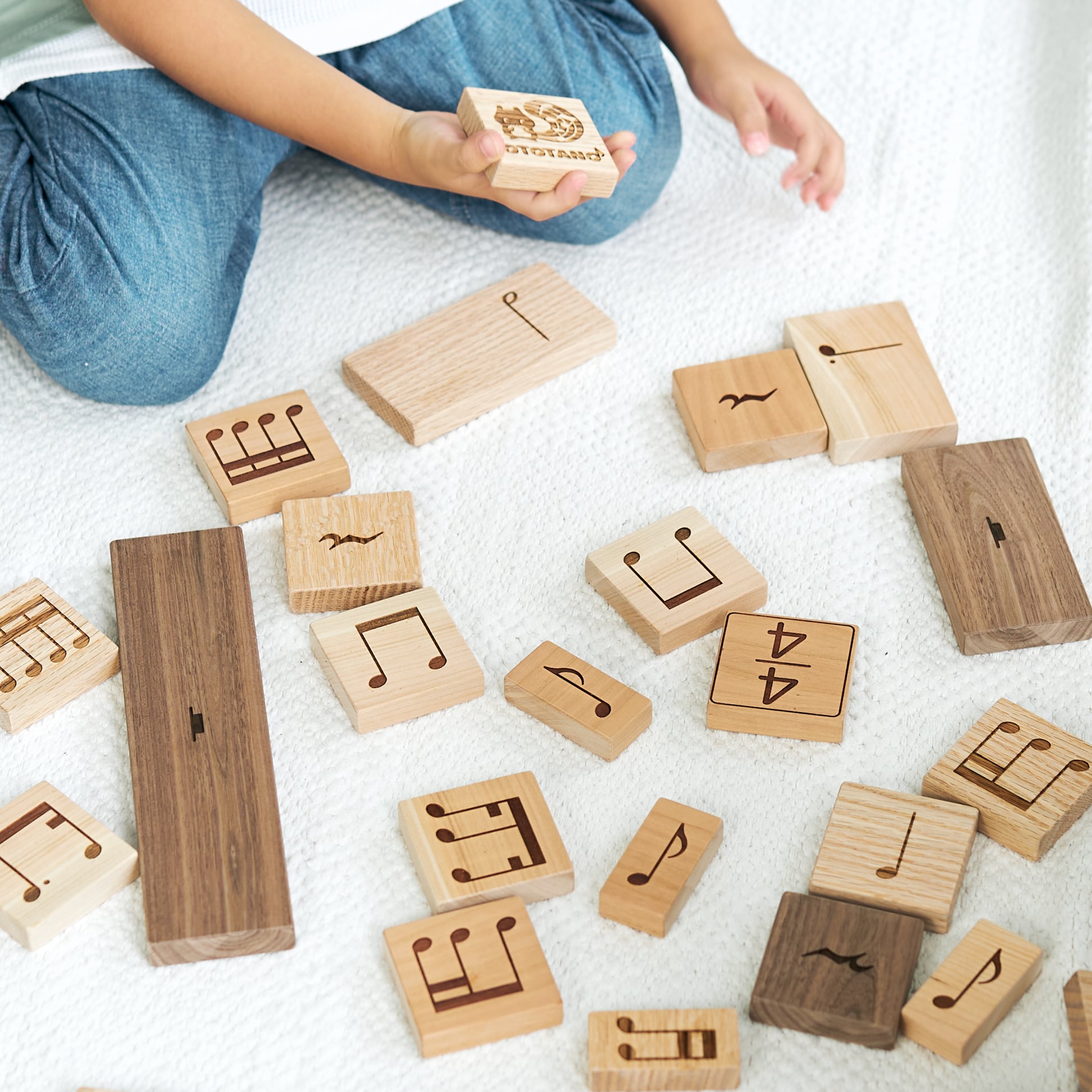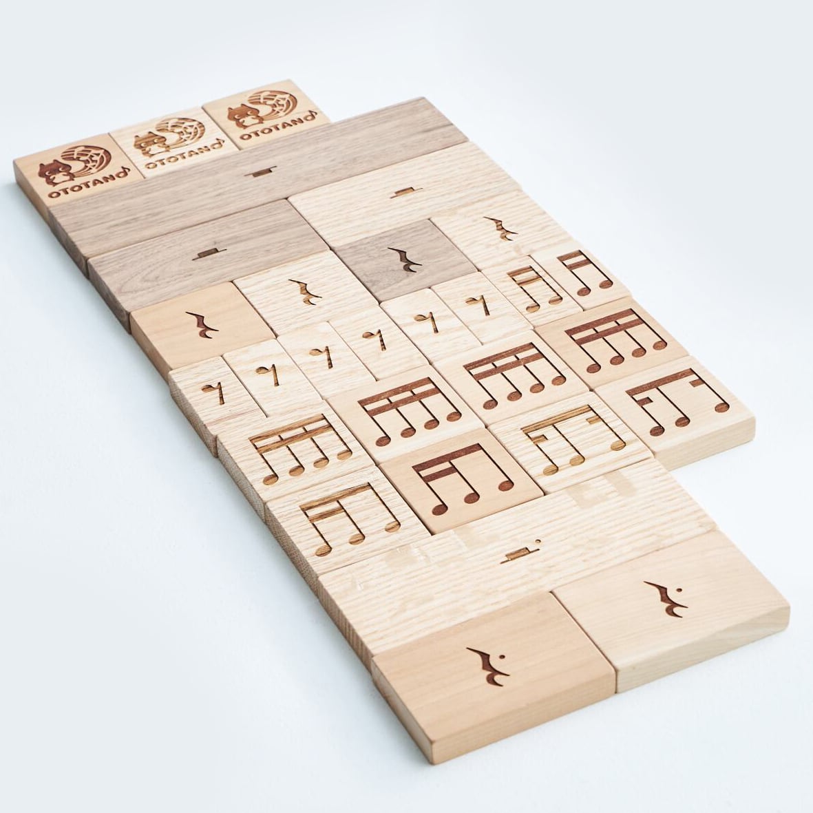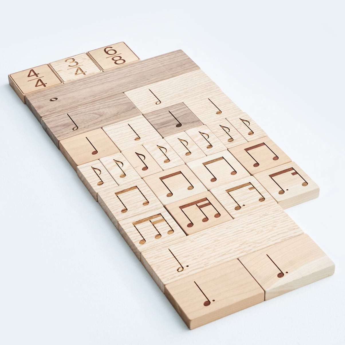 数種類の木で作られた音符や休符のピースを、バケツいっぱいに詰め込みました。