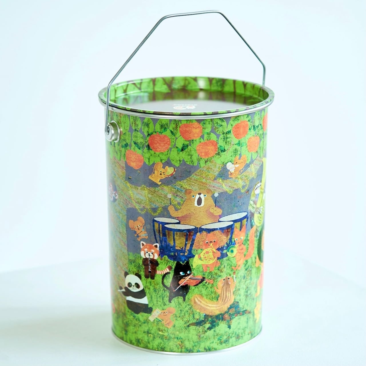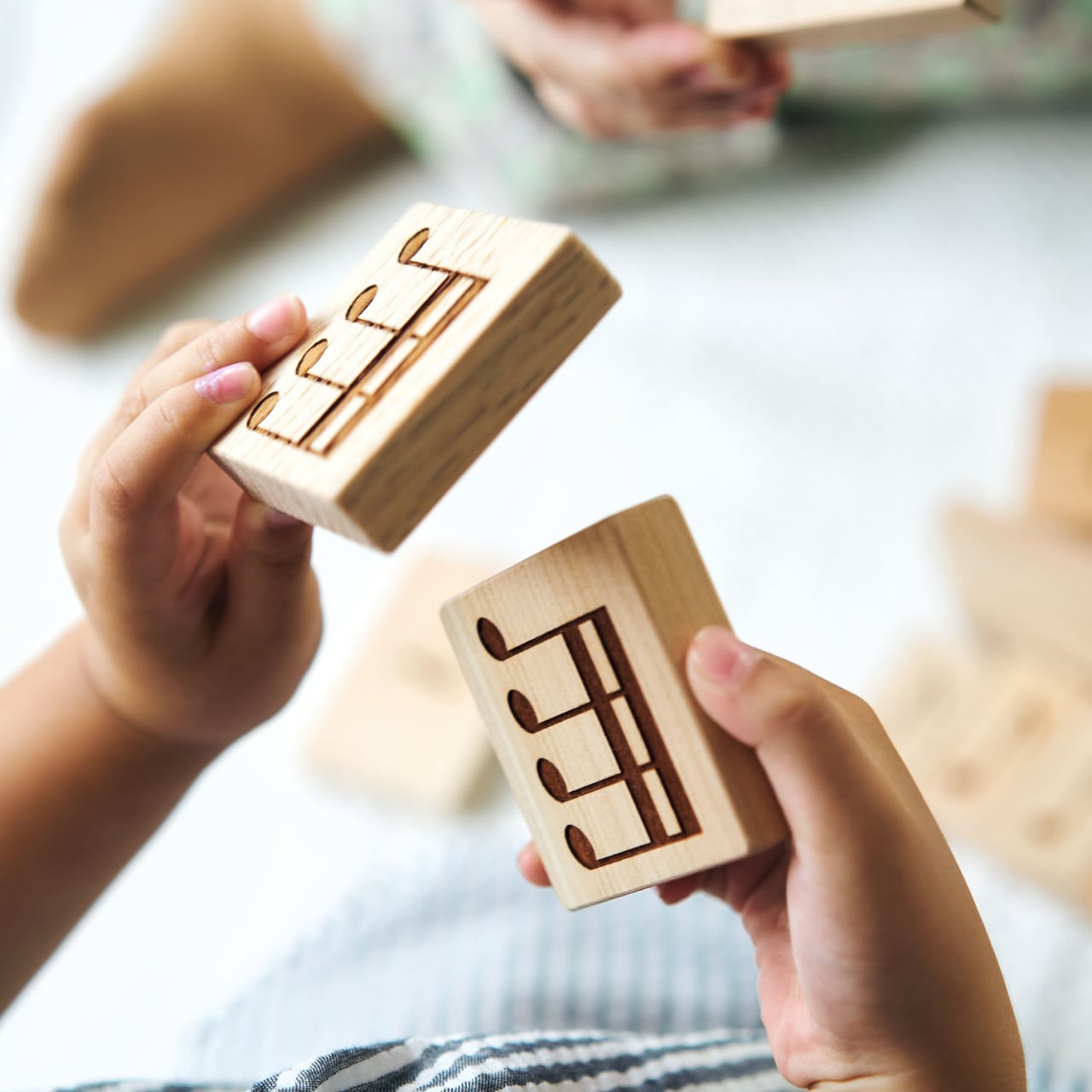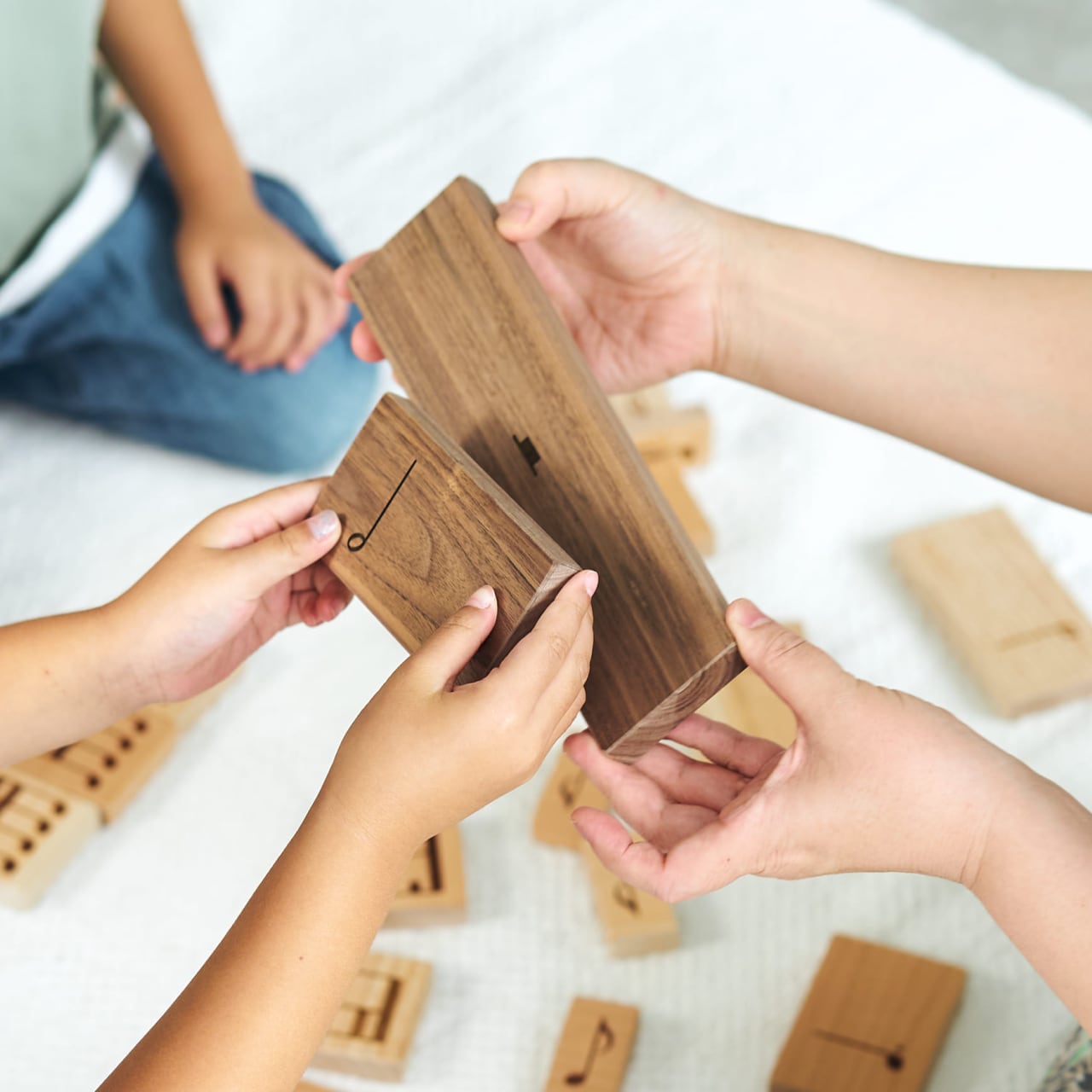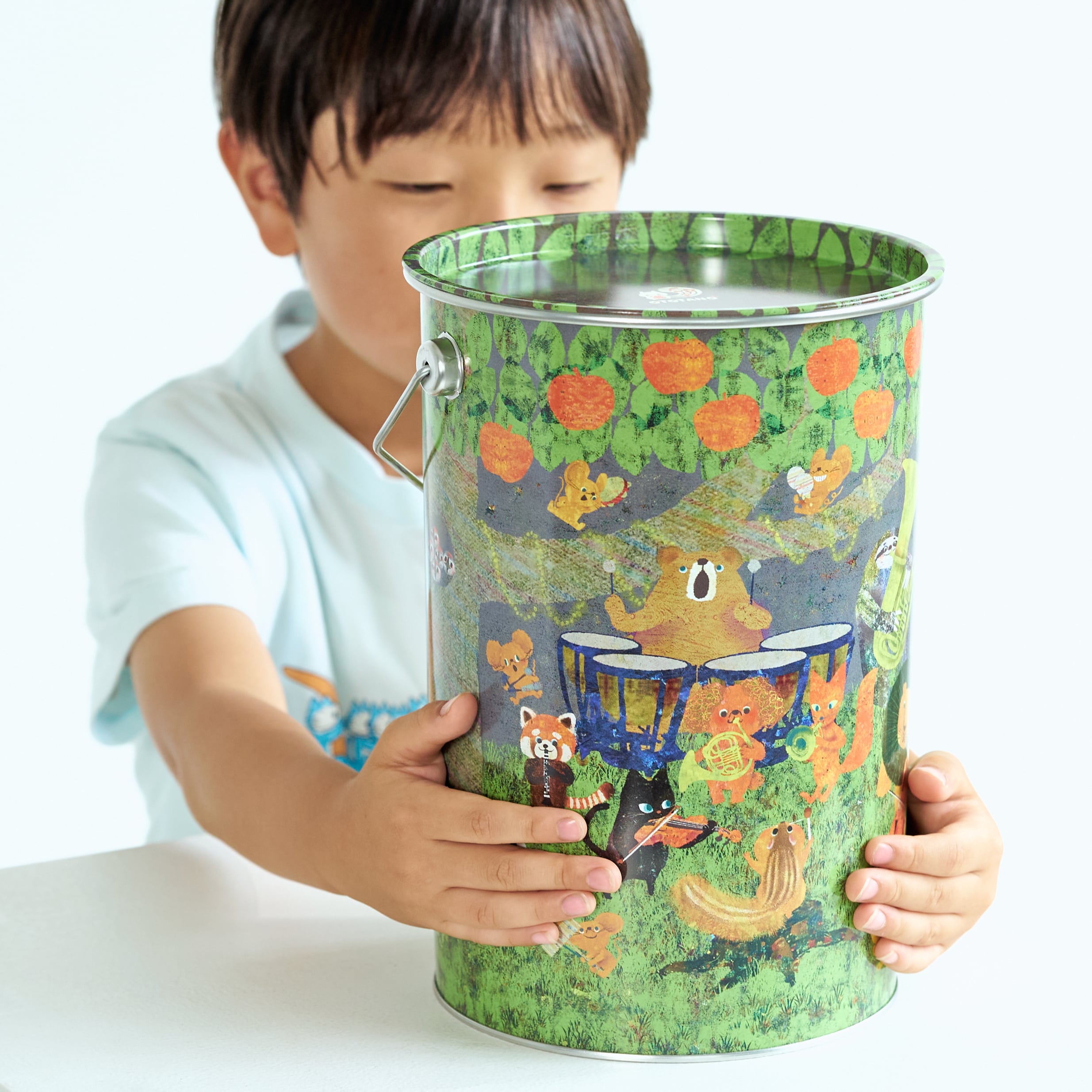数種類の木で作られた音符や休符のピースを、バケツいっぱいに詰め込みました。